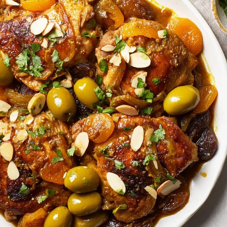 Spoon this tagine over fluffy couscous, rice, or warm flatbread that you use to scoop up the sauce. The combination of the tender chicken, those pockets of soft apricot, and the briny olives needs something gentle underneath to catch all the liquid gold. A crisp white wine like Sauvignon Blanc cuts through the richness beautifully, or simply pour cold water with a squeeze of lemon.