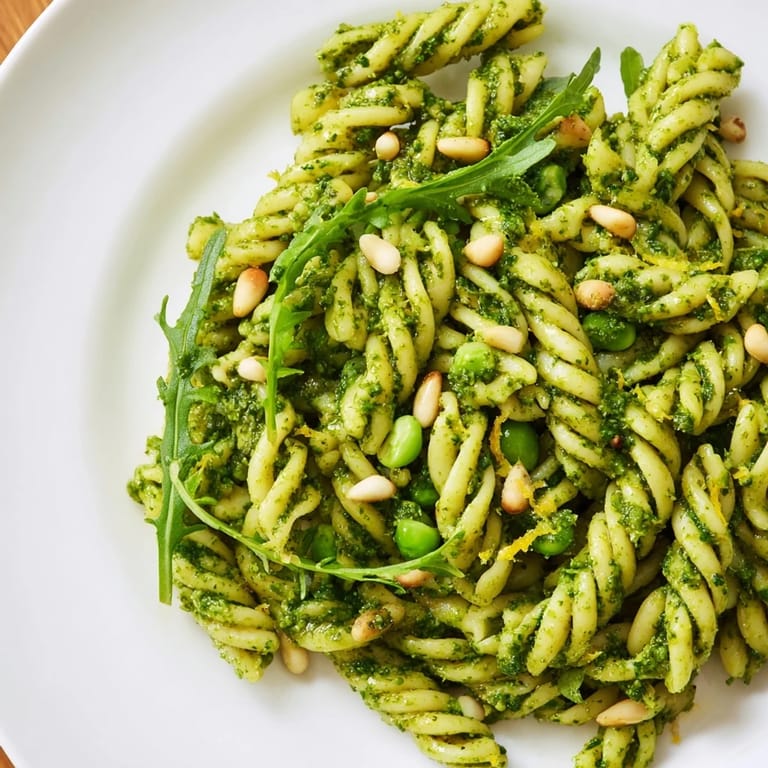 Substitute the toasted pine nuts with toasted sunflower seeds in both the pesto and the final toss. Sunflower seeds provide the same nutty flavor and satisfying crunch while accommodating nut allergies.